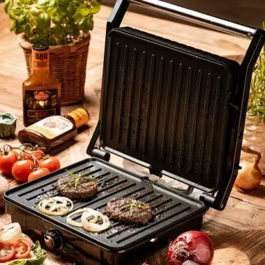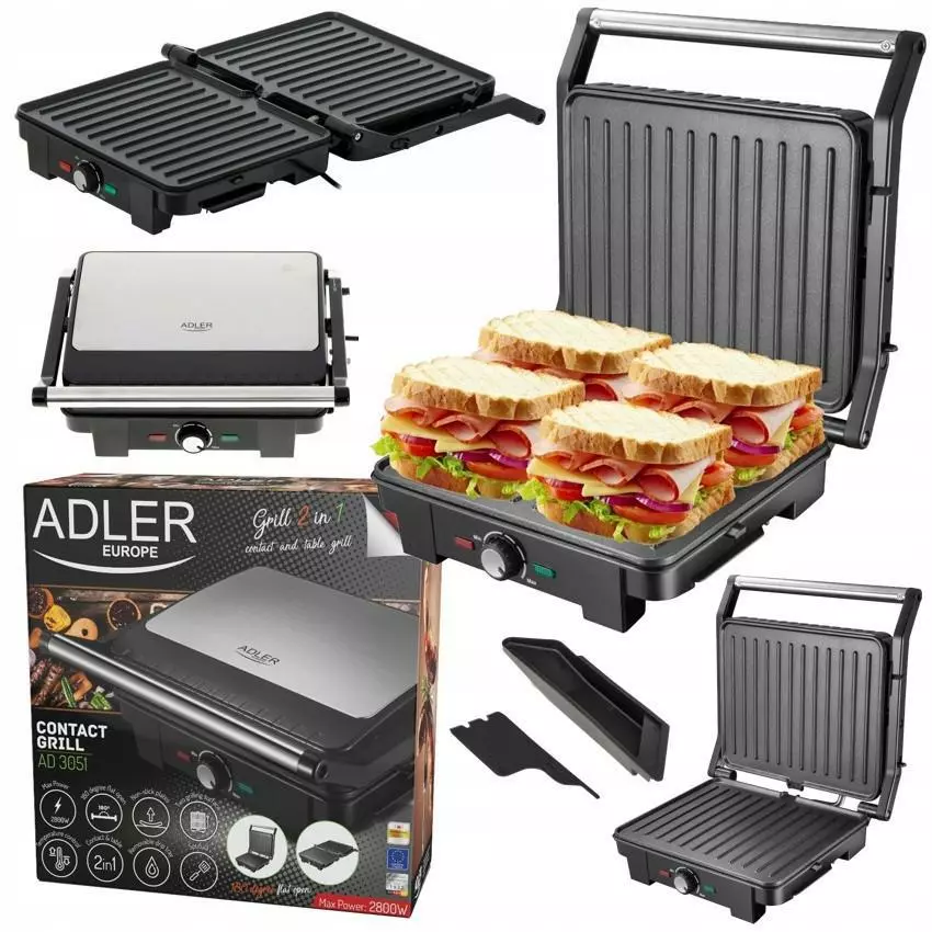 Гриль Adler AD 3051 Электрический гриль Adler AD 3051 с максимальной мощностью 2800 Вт позволяет готовить широкий спектр горячих блюд - от гамбургеров, стейков, курицы и другого мяса до жареного сыра и овощей. Нагревательные пластины покрыты тефлоновым покрытием, благодаря которому продукты не прилипают, поэтому вы можете очистить гриль за считанные секунды. Это также позволяет вам готовить более здоровые блюда, поскольку вам не нужно использовать жир. AD 3051 имеет достаточно большую зону для гриля, чтобы приготовить еду для семьи или компании друзей. Характеристики: Панели открываются на 180 градусов Регулируемый наклон пластины Контроль температуры Антипригарные пластины гриля Индикаторные лампочки Съёмный поддон для капель Лопатка прилагается Максимальная мощность 2800 Вт Площадь решетки в разложенном виде: 1392 см2 Большая площадь пластины 29 * 24 см