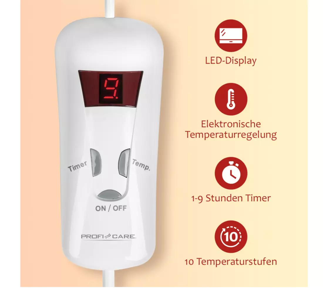 Электроодеяло PROFICARE PC-WZD 3061 обеспечит длительное и равномерное распределение тепла, расслабит мышцы и улучшит кровообращение. Это позволит вам с удовольствием отдохнуть в теплой постели всего через несколько минут после включения. Регулятор температуры позволит выбрать уровень температуры и обеспечит защиту от перегрева.