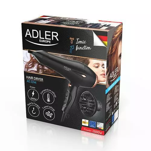 Фен AD 2244 - це вибір більш вимогливих людей, які піклуються про своє волосся і хочуть надати йому гарний вигляд. Сушарка оснащена регуляторами як сили обдування, так і його температури, в тому числі холодного обдування. Набір сушарки поставляється з концентратором і дифузором для більших можливостей сушіння та укладання. Функція іонізації живить і зробить неслухняне волосся менш статичним. Крім того, сушарку вирізняє сучасний дизайн.