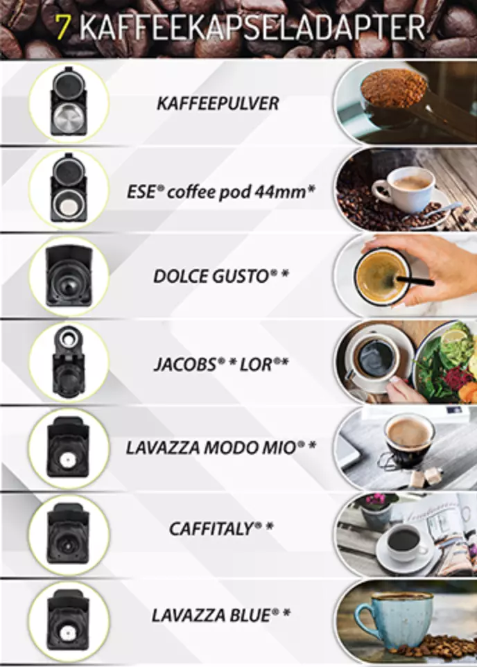 - Поставляється з 5 змінними адаптерами для капсул, сумісними з такими капсулами: