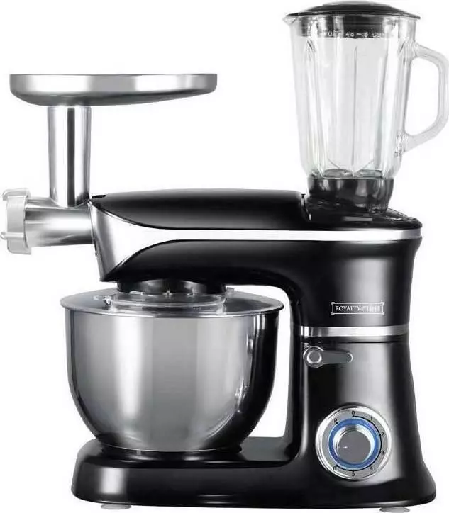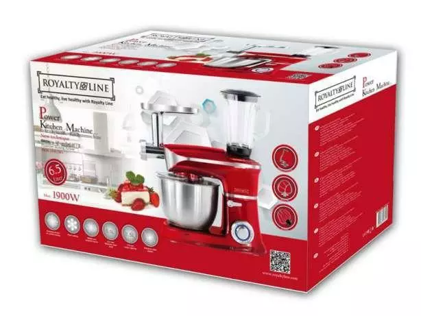 Кухонный комбайн непременно упростит работу на кухне, ведь он не только многофункциональный, но и достаточно быстро справляется с любой поставленной задачей. Мы предлагаем вашему вниманию кухонный комбайн от торговой марки Royalty Line, который успешно соединил в себе тестомес, мясорубку и блендер. Комбайн выполнен из прочных материалов, верх ― плотный пластик, чаша для замеса теста выполнены из нержавеющей стали, мясорубка и все аксессуары из прочного сплава металла, чаша блендера выполнена из толстого стекла. В комплекте ― стандартный набор насадок для мясорубки, крюк для замеса, насадка для взбивания и для непосредственного замеса теста. Мощность комбайна ― 1900 Вт. 6 режимов работы, плюс режим пульсации и плавная регулировка. Кухонный комбайн работаем сравнительно тихо. В комплекте есть прозрачная защита от брызг, объем чаши блендера 1,5 л, есть мерочная шкала, объем чаши для замеса ― 6,5 л. Мясорубку и блендер легко устанавливать. Комбайн быстро разбирается. У основания есть присоски, которые не допускают скольжения комбайна по любой поверхности.