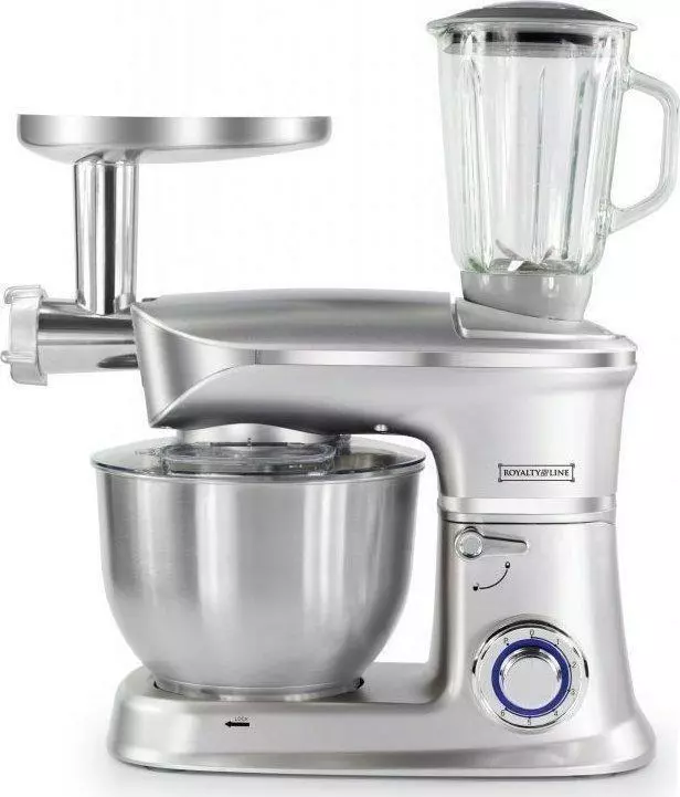 Кухонный комбайн непременно упростит работу на кухне, ведь он не только многофункциональный, но и достаточно быстро справляется с любой поставленной задачей. Мы предлагаем вашему вниманию кухонный комбайн от торговой марки Royalty Line, который успешно соединил в себе тестомес, мясорубку и блендер. Комбайн выполнен из прочных материалов, верх ― плотный пластик, чаша для замеса теста выполнены из нержавеющей стали, мясорубка и все аксессуары из прочного сплава металла, чаша блендера выполнена из толстого стекла. В комплекте ― стандартный набор насадок для мясорубки, крюк для замеса, насадка для взбивания и для непосредственного замеса теста. Мощность комбайна ― 1900 Вт. 6 режимов работы, плюс режим пульсации и плавная регулировка. Кухонный комбайн работаем сравнительно тихо. В комплекте есть прозрачная защита от брызг, объем чаши блендера 1,5 л, есть мерочная шкала, объем чаши для замеса ― 6,5 л. Мясорубку и блендер легко устанавливать. Комбайн быстро разбирается. У основания есть присоски, которые не допускают скольжения комбайна по любой поверхности.