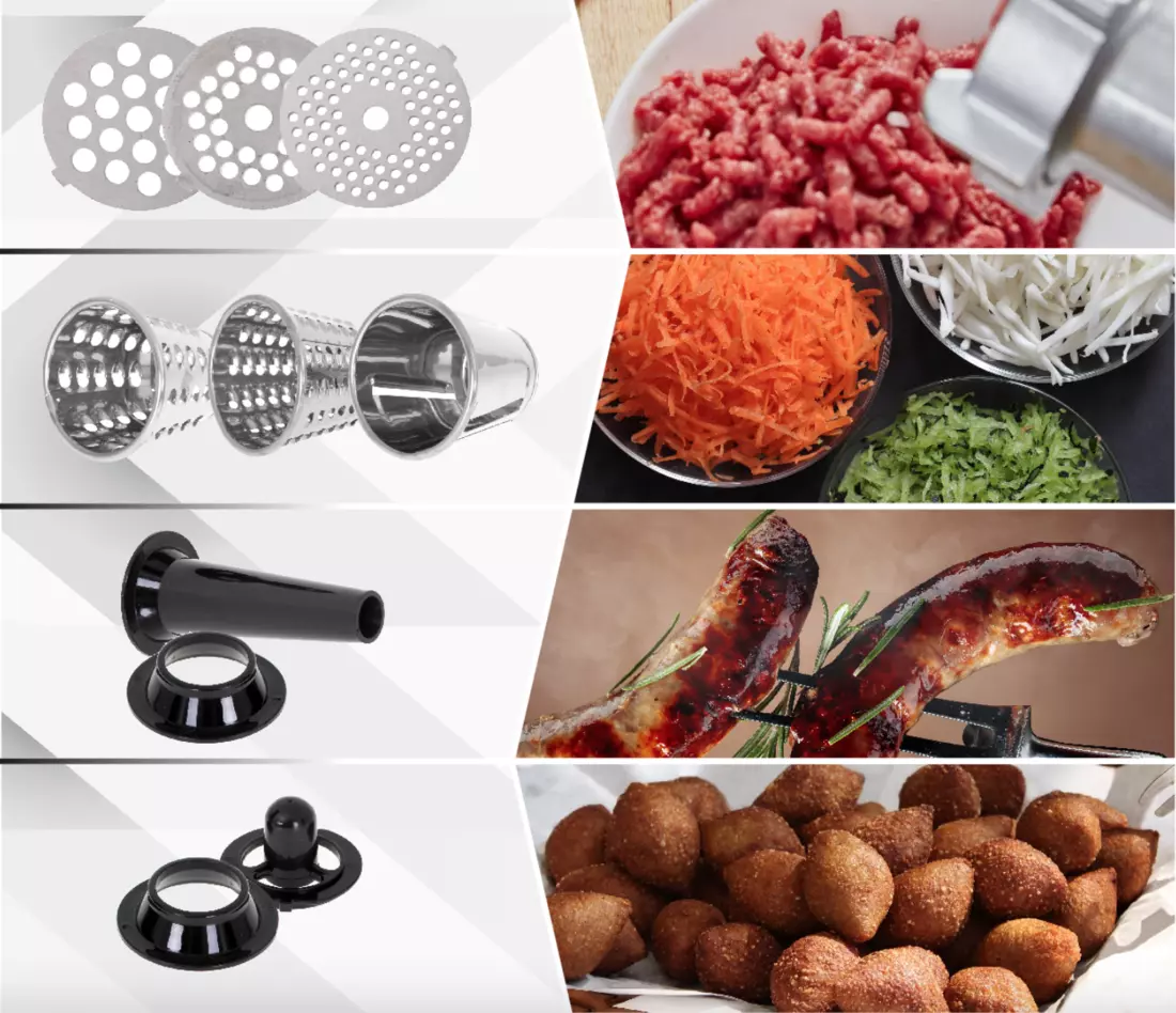 Солідний прилад для тих, хто хоче самостійно приготувати ковбаски та фарш. М’ясорубка оснащена 3 змінними сітками з нержавіючої сталі з діаметром отворів 3мм, 5мм, 7мм та овочерізкою з трьома лезами.Все виготовлено з міцних матеріалів, легко розбирається та очищається. Пристрій має вбудоване сховище для ковпачків і ситечок, щоб запобігти їх втраті. Також до апарату входять насадка для м’ясних виробів для виробництва ковбас та насадка Kebbe, що дозволяє відчути себе професійним кухарем та подбати про здорове харчування сім’ї. Машину легко зібрати, а поперечний ніж з нержавіючої сталі гарантує багаторічне безперебійне використання.