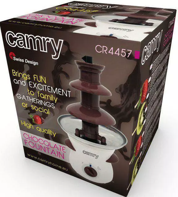 Шоколадный фонтан применим для домашних и семейных торжеств и общественных мероприятий. Ваши гости смогут оценить не только уникальный внешний вид аппарата - как течёт шоколад , но прежде всего, насладиться изысканным вкусом молочного, черного и белого шоколада. Шоколадный фонтан также имеет большую привлекательность для детей и является интересным решением для тех, кто любит необычную сервировку блюда - в данном случае десертов. Подходит как для узкого коллектива, так и для больших шумных компаний. Camry CR 4457 - это прекрасный подарок для вас и ваших близких.