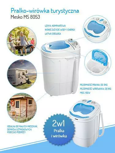 Туристическая стиральная машина, идеально подходит для дальних поездок с семьей. Он легко помещается в багажнике или караване. Это также хорошо работает в домах отдыха благодаря тихой и эффективной работе. Он весит всего 6 кг, но может хранить до 3 кг одежды. Он достигает максимальной мощности 400 Вт, что достаточно для стирки белья, используемого во время занятий спортом или работы в саду. Стиральная машина, предназначенная для потребления как можно меньше воды и энергии, является хорошим оборудованием для тех, кто ценит чистоту и активность одновременно. Он также имеет функцию отжима, которую можно использовать после стирки белья и слива воды.