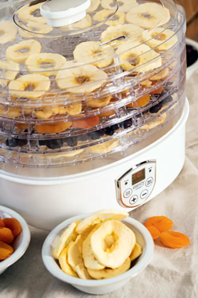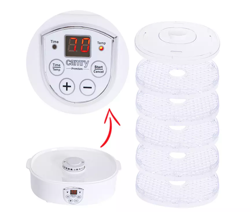 Практична сушарка для грибів, трав і продуктів потужністю 550 Вт, в ній можна сушити гриби, овочі, фрукти і трави, що полегшує їх зберігання і не псується. Сушильна машина працює тихо і не заважає домашньої діяльності. Великі екрани дозволяють розмістити велику кількість дрібних продуктів. У той же час укладання шарів гарантує, що пристрій не займає багато місця. Завдяки двоступеневому регулюванню температури сушку можна проводити з різною інтенсивністю. Для безпеки сушильна машина оснащена системою захисту від перегріву, яка при необхідності автоматично вимикає пристрій. Прилад оснащений 5 рівномірно розташованими піддонами для кращої циркуляції повітря. Висота підносу 3 см. Використовуючи панель керування з РК-дисплеєм на передній панелі машини, Ви можете встановити температурний діапазон і час роботи цікавить вас сушарки. Дегідратор оснащений таймером, завдяки якому можна встановити час його роботи в діапазоні від 1 до 70 годин.