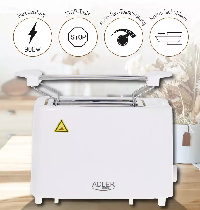 Тостер Adler AD 3223 призначений для приготування смачних та хрумких тостів. Передбачає два відділення для хліба. Встановлюється на стіл за допомогою прогумованих ніжок, тому немає ризику скинути пристрій на підлогу.